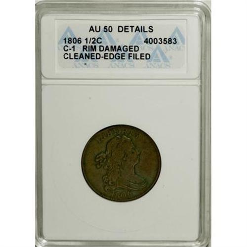<B>1806 1/2 C Small 6, No Stems--Cleaned, Edge Filed, Rim Damaged--ANACS. AU50 Details.</B></I> C-1. NGC Census: (17/295). PCGS Population (42/150). Mintage: 356,000. Numismedia Wsl. Price for NGC/PCGS coin in AU50: $475. (#1093)<BR><BR><B>Coin Engraver:</B> Robert Scot<BR><BR><b>Shipping:</b> Coins & Currency (<a target="_blank" href="http://www.heritageauctions.com/common/shipping.php">view shipping information</a>)
