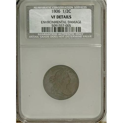 <B>1806 1/2 C Small 6, No Stems--Environmental Damage--NCS. VF Details.</B></I> NGC Census: (16/295). PCGS Population (42/148). Mintage: 356,000. Numismedia Wsl. Price for NGC/PCGS coin in AU50: $475. (#1093)<BR><BR><B>Coin Engraver:</B> Robert Scot<BR><BR><b>Shipping:</b> Coins & Currency (<a target="_blank" href="http://www.heritageauctions.com/common/shipping.php">view shipping information</a>)