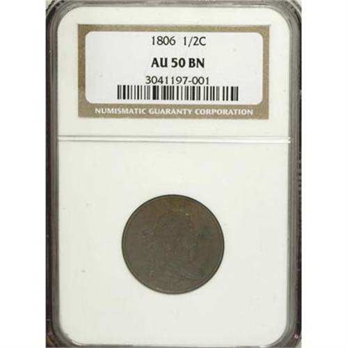 <B>1806 1/2 C Small 6, No Stems AU50 NGC.</B></I> NGC Census: (17/295). PCGS Population (42/152). Mintage: 356,000. Numismedia Wsl. Price for NGC/PCGS coin in AU50: $475. (#1093)<BR><BR><B>Coin Engraver:</B> Robert Scot<BR><BR><b>Shipping:</b> Coins & Currency (<a target="_blank" href="http://www.heritageauctions.com/common/shipping.php">view shipping information</a>)