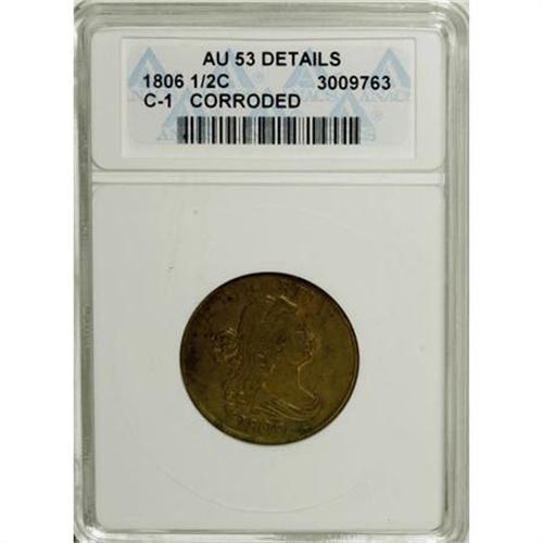 <B>1806 1/2 C Small 6, No Stems--Corroded--ANACS. AU53 Details. C-1.</B></I> NGC Census: (17/278). PCGS Population (13/136). Mintage: 356,000. Numismedia Wsl. Price for NGC/PCGS coin in AU53: $590. (#1093)<BR><BR><B>Coin Engraver:</B> Robert Scot<BR><BR><b>Shipping:</b> Coins & Currency (<a target="_blank" href="http://www.heritageauctions.com/common/shipping.php">view shipping information</a>)