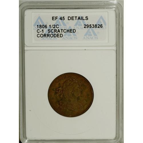 <B>1806 1/2 C Small 6, No Stems--Corroded, Scratched--ANACS. XF45 Details.</B></I> C-1. NGC Census: (10/309). PCGS Population (22/183). Mintage: 356,000. Numismedia Wsl. Price: $313. (#1093)<BR><BR><b>Shipping:</b> Coins & Currency (<a target="_blank" href="http://www.heritageauctions.com/common/shipping.php">view shipping information</a>)