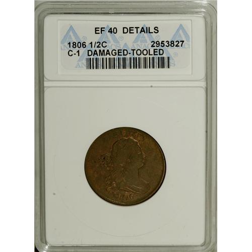 <B>1806 1/2 C Small 6, No Stems--Damaged, Tooled--ANACS. XF40 Details.</B></I> C-1. NGC Census: (9/319). PCGS Population (35/205). Mintage: 356,000. Numismedia Wsl. Price: $225. (#1093)<BR><BR><b>Shipping:</b> Coins & Currency (<a target="_blank" href="http://www.heritageauctions.com/common/shipping.php">view shipping information</a>)