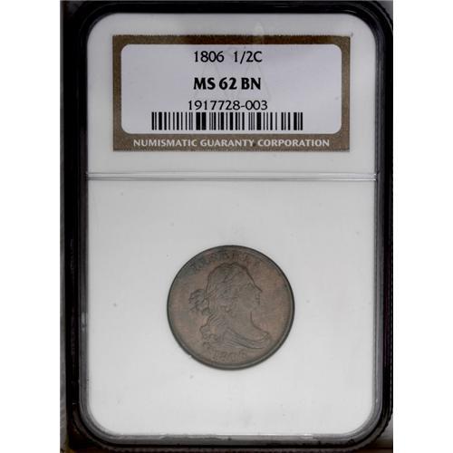 <B>1806<1/2 C> Small 6, No Stems MS62 Brown NGC.</B></I> C-1, B-3, R.1. Light golden-tan toning graces this well struck and satiny piece, with glimpses of charcoal-gray mostly limited to the upper left obverse border. Wispy field marks limit the grade. EAC 50. <BR><BR><B>Important notice:</B> Heritage usually auctions material at the rate of 200-250 lots per hour. On some occasions eBay Live bid software or the Internet may not be able to keep up with the pace of the auction. We recommend placing a realistic absentee bid now as insurance to avoid disappointment. Occasionally the auctioneer may eliminate or reject an eBay Live bid, and the auctioneer may also reopen a lot after the close of the eBay live bidding (usually because we missed an audience bid), and may reject your bid even if it shows you as the winning bidder. By bidding via eBay Live, you agree that Heritage may award the lot to another bidder at its sole discretion under the circumstances described above or any other reasonable circumstances. Since eBay bids are not shown to us until we open the lot on the floor, we treat those bids just like floor bids. In most cases the floor responds before the eBay bid is presented to us, due to Internet lag time, so for consistency we have made it a policy that floor bids are always considered first over tie eBay live bids. Also please note that all Heritage lots purchased through eBay Live carry a 20% Buyer's Premium. Please make sure you read the Terms and Conditions before you bid. This lot is being auctioned in conjunction with a live floor auction by Heritage Galleries & Auctioneers. All final auction and invoice information will be supplied by Heritage Galleries & Auctioneers, and all other information should be considered preliminary. Lot:217 <BR><BR><B>Winning Notification and Billing:</B> After the FINAL session in this auction is complete, Heritage will send e-mail and snail mail invoices. This process normally takes several days. All final auction and invoice information will be supplied by Heritage Galleries & Auctioneers, and all other information should be considered preliminary. <BR><BR>This auction will be conducted on a live auction floor and over the Internet through eBay Live. If you choose to place an absentee bid, please take a moment to <font color='#0000ff'><u><a href='http://pages.ebay.com/liveauctions/help/before/laabsentee.html'>learn how eBay Live absentee bidding works</a></u></font><font color='#000000'>
