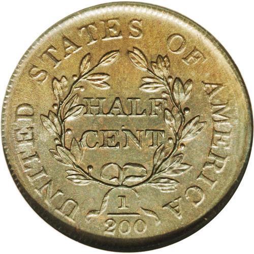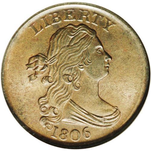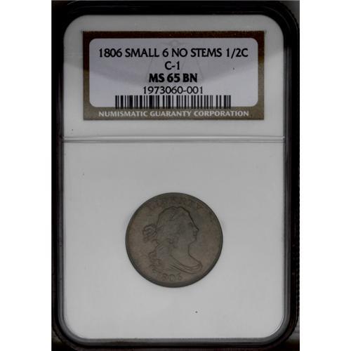 <B>1806<1/2 C> Small 6, No Stems MS65 Brown NGC.</B></I> C-1, B-3, R.1. The only No Stems die marriage from 1806 and a more available issue in and around Mint State thanks to an early hoard, although most Uncirculated pieces grade MS63 or lower. This exceptionally well preserved representative is very well defined in all areas and ranges of color from glimpses of lighter golden-tan to rich violet-brown on the reverse. Census: 3 in 65, 0 finer (3/06). EAC 60. <BR><BR><B>Important notice:</B> Heritage usually auctions material at the rate of 200-250 lots per hour. On some occasions eBay Live bid software or the Internet may not be able to keep up with the pace of the auction. We recommend placing a realistic absentee bid now as insurance to avoid disappointment. Occasionally the auctioneer may eliminate or reject an eBay Live bid, and the auctioneer may also reopen a lot after the close of the eBay live bidding (usually because we missed an audience bid), and may reject your bid even if it shows you as the winning bidder. By bidding via eBay Live, you agree that Heritage may award the lot to another bidder at its sole discretion under the circumstances described above or any other reasonable circumstances. Since eBay bids are not shown to us until we open the lot on the floor, we treat those bids just like floor bids. In most cases the floor responds before the eBay bid is presented to us, due to Internet lag time, so for consistency we have made it a policy that floor bids are always considered first over tie eBay live bids. Also please note that all Heritage lots purchased through eBay Live carry a 20% Buyer's Premium. Please make sure you read the Terms and Conditions before you bid. This lot is being auctioned in conjunction with a live floor auction by Heritage Galleries & Auctioneers. All final auction and invoice information will be supplied by Heritage Galleries & Auctioneers, and all other information should be considered preliminary. Lot:218 <BR><BR><B>Winning Notification and Billing:</B> After the FINAL session in this auction is complete, Heritage will send e-mail and snail mail invoices. This process normally takes several days. All final auction and invoice information will be supplied by Heritage Galleries & Auctioneers, and all other information should be considered preliminary. <BR><BR>This auction will be conducted on a live auction floor and over the Internet through eBay Live. If you choose to place an absentee bid, please take a moment to <font color='#0000ff'><u><a href='http://pages.ebay.com/liveauctions/help/before/laabsentee.html'>learn how eBay Live absentee bidding works</a></u></font><font color='#000000'>