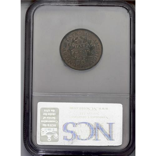 <B>1806<1/2 C> Small 6, No Stems--Obverse Scratched--NCS. UNC Details.</B></I> C-1, B-3, R.1. A nicely detailed example, largely medium-brown with significant areas of faded red. Minor abrasions appear on each side, and an X has been deliberately scratched near 3 o'clock on the obverse. EAC 40.