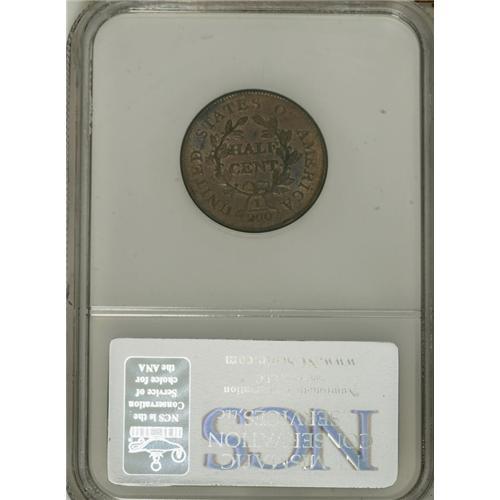 <B>1806 1/2 C Small 6, No Stems--Obverse Scratched--NCS. Unc Details.</B></I> C-1, B-3, R.1. An unworn and generally lovely example of the Stemless variety that has zones of mahogany and chocolate-brown on each side. The "X" scratched in the right obverse field is surprisingly unobtrusive. EAC 50.<BR><BR><b>Shipping:</b> Coins & Currency (<a target="_blank" href="http://www.heritageauctions.com/common/shipping.php">view shipping information</a>)