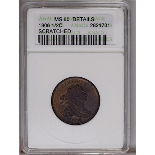 1806 1/2 C Small 6, No Stems--Scratched--ANACS. MS60 D 1806[1/2 C] Small 6, No Stems--Scratched--ANA