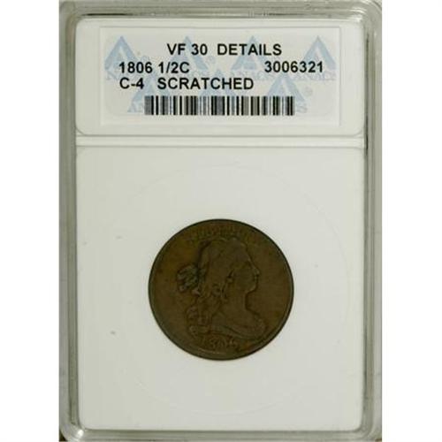 <B>1806 1/2 C Small 6, No Stems--Scratched--ANACS. VF30 Details.</B></I> C-4. NGC Census: (5/339). PCGS Population (17/274). Mintage: 356,000. Numismedia Wsl. Price for NGC/PCGS coin in VF30: $165. (#1093)<BR><BR><B>Coin Engraver:</B> Robert Scot<BR><BR><b>Shipping:</b> Coins & Currency (<a target="_blank" href="http://www.heritageauctions.com/common/shipping.php">view shipping information</a>)