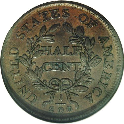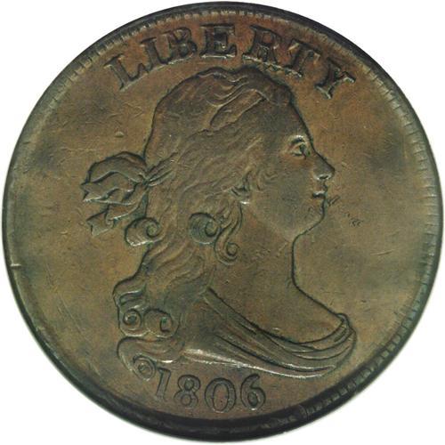 <B>1806<1/2 C> Small 6, Stems AU55 NGC.</B></I> C-2, B-1, R.4. The scarce variety with a small 6 in the date, and with stems to the wreath on the reverse. In fact, two different die marriages are known for this variety, and both are important to collectors. Nearly all known examples of each of these varieties can only be found in the lowest grades. An attractive example that is characterized by smooth olive and steel-brown surfaces, the color intermingled on both sides. The obverse is marred by a few light abrasions, although the reverse is essentially perfect. EAC 35.