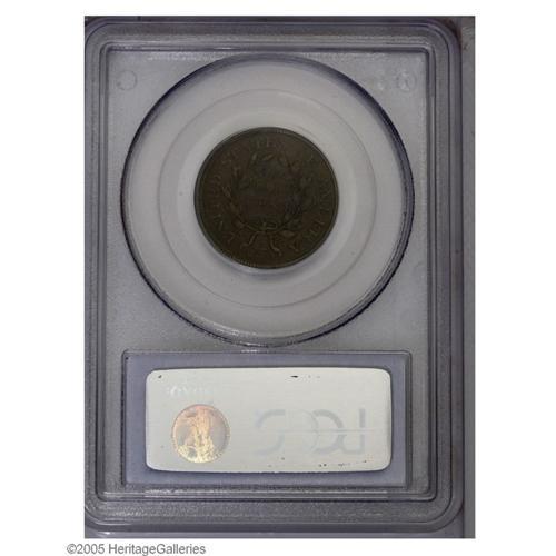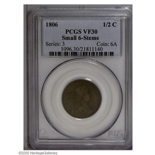 <B>1806<1/2 C> Small 6, Stems VF30 PCGS.</B></I> B-1, C-2, R.4. Two different die varieties are known of this Small 6, Stems variety. The distinguishing feature is the position of the digit 6, either low in the field as here, or higher in the field with the upper point very close to the drapery. This scarce variety is important to a couple different classes of collectors, being of special interest to the variety collector, or to the <I>Guide Book</B></I> collector who is seeking one example of each coin listed in the popular reference.<BR> Grayish-brown devices with intermingled chocolate and steel-brown color in the fields. Slight corrosion and verdigris is visible around the devices. Although the surfaces have their usual quota of small abrasions and marks, only a few minor scratches or other defects are noted. The specimen offered here is an intermediate die state example with light clash marks on the obverse, through the bases of RT in LIBERTY. In later states, a die crack develops through the digit 6, but no such feature is visible on this example.