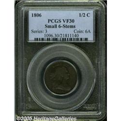 <B>1806 1/2 C Small 6, Stems VF30 PCGS.</B></I> B-1, C-2, R.4. Two different die varieties are known of this Small 6, Stems variety. The distinguishing feature is the position of the digit 6, either low in the field as here, or higher in the field with the upper point very close to the drapery. This scarce variety is important to a couple different classes of collectors, being of special interest to the variety collector, or to the <I>Guide Book</B></I> collector who is seeking one example of each coin listed in the popular reference. Of course, those collectors forming PCGS Registry sets of half cents will also want to own this coin.<BR> Grayish-brown devices with intermingled chocolate and steel-brown color in the fields. Slight corrosion and verdigris is visible around the devices. Although the surfaces have their usual quota of small abrasions and marks, only a few minor scratches or other defects are noted. The specimen offered here is an intermediate die state example with light clash marks on the obverse, through the bases of RT in LIBERTY. In later states, a die crack develops through the digit 6, but no such feature is visible on this example.