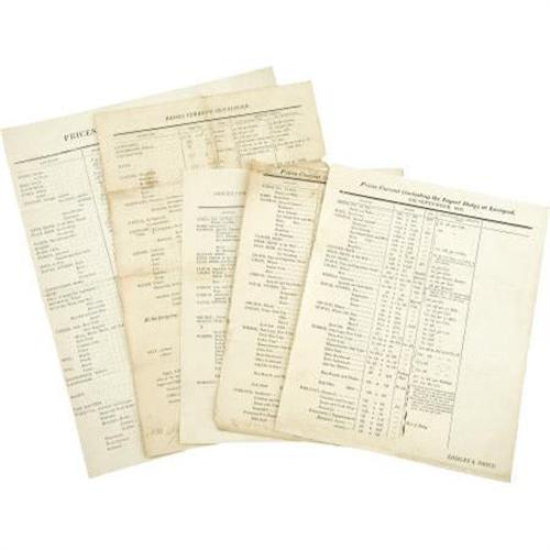 <B>Group of Five Price Schedules for Imported Goods into Liverpool 1806-1810</B></I>. Various sizes, average 8” x 10”, most two pages, with dates from 1806 through 1810, printed for Lodges & Tooth Liverpool , each titled “Prices Current (including the Import Duty) at Liverpool”, some toning, else generally in very good condition. These schedules list goods from “Ashes” to “Tobacco” with their corresponding prices per weight, showing the appropriate duty for each. Of particular note is a marginal note on the 1807 schedule next to the entry for cotton which reads “<I>Uplands & New Orleans Cottons, if clean, & prime in quality, are salable; but inferior soils will scarcely sell at any price</B></I>”. The 1806 schedule has the hand-written notation “<I>Rye flour and Indian corn meal cannot be imported</B></I>”. <I>Ex. Henry E. Luhrs Collection</B></I>.<BR><BR><BR><b>Shipping:</b> Flat Material, Small (<a target="_blank" href="http://www.heritageauctions.com/common/shipping.php">view shipping information</a>)