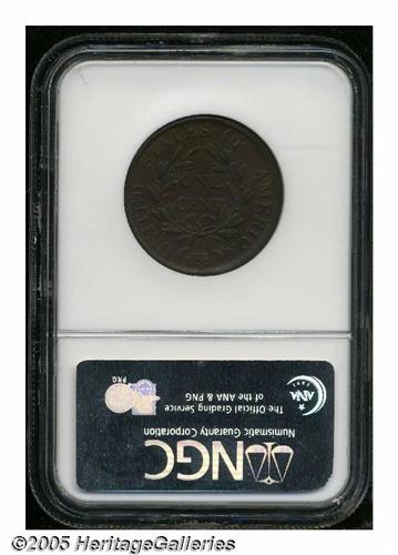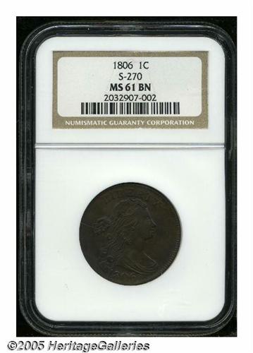 <B>1806<1C> MS61 Brown NGC.</B></I> S-270, R.1. From the only dies for the date, this is a late state piece with denticles absent from the reverse and left obverse. A lovely chocolate-brown piece with boldly struck major devices. A couple of wispy pinscratches on the portrait and a single spot on the hair determine the grade. Population: 3 in 61, 4 finer (4/05).