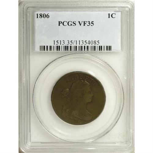 <B>1806 1C VF35 PCGS.</B></I> S-270, B-1, R.1. This medium brown Draped Bust cent displays pleasing hair definition and has only moderate field marks. Minor build-up within the wreath and reverse letters is expected from its days in circulation. EAC 25.<BR><BR><b>Shipping:</b> Coins & Currency (<a target="_blank" href="http://www.heritageauctions.com/common/shipping.php">view shipping information</a>)