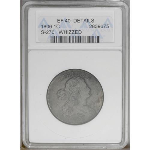 <B>1806<1C>--Whizzed--ANACS. XF40 Details.</B></I> S-270, B-1, R.1. The only dies for this conditionally scarce date. This moderately porous example has been burnished, and the cheek has a couple of subdued marks. All major design details are sharp. EAC 12. <BR><BR><B>Important notice:</B> Heritage usually auctions material at the rate of 200-250 lots per hour. On some occasions eBay Live bid software or the Internet may not be able to keep up with the pace of the auction. We recommend placing a realistic absentee bid now as insurance to avoid disappointment. Occasionally the auctioneer may eliminate or reject an eBay Live bid, and the auctioneer may also reopen a lot after the close of the eBay live bidding (usually because we missed an audience bid), and may reject your bid even if it shows you as the winning bidder. By bidding via eBay Live, you agree that Heritage may award the lot to another bidder at its sole discretion under the circumstances described above or any other reasonable circumstances. Since eBay bids are not shown to us until we open the lot on the floor, we treat those bids just like floor bids. In most cases the floor responds before the eBay bid is presented to us, due to Internet lag time, so for consistency we have made it a policy that floor bids are always considered first over tie eBay live bids. Also please note that all Heritage lots purchased through eBay Live carry a 20% Buyer's Premium. Please make sure you read the Terms and Conditions before you bid. This lot is being auctioned in conjunction with a live floor auction by Heritage Galleries & Auctioneers. All final auction and invoice information will be supplied by Heritage Galleries & Auctioneers, and all other information should be considered preliminary. Lot:254 <BR><BR><B>Winning Notification and Billing:</B> After the FINAL session in this auction is complete, Heritage will send e-mail and snail mail invoices. This process normally takes several days. All final auction and invoice information will be supplied by Heritage Galleries & Auctioneers, and all other information should be considered preliminary. <BR><BR>This auction will be conducted on a live auction floor and over the Internet through eBay Live. If you choose to place an absentee bid, please take a moment to <font color='#0000ff'><u><a href='http://pages.ebay.com/liveauctions/help/before/laabsentee.html'>learn how eBay Live absentee bidding works</a></u></font><font color='#000000'>