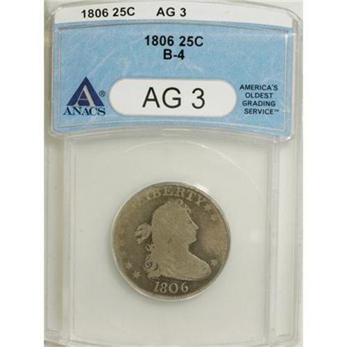 <B>1806 25C AG3 ANACS.</B></I> B-4. NGC Census: (9/285). PCGS Population (6/378). Mintage: 206,124. Numismedia Wsl. Price for NGC/PCGS coin in AG3 : $103. (#5314)<BR><BR><b>Shipping:</b> Coins & Currency (<a target="_blank" href="http://www.heritageauctions.com/common/shipping.php">view shipping information</a>)