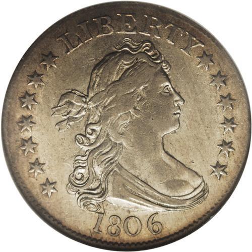 <B>1806 25C AU55 NGC.</B></I> B-3, R.1. The date is high with the digit 1 touching the curl and the point of the 6 barely missing the drapery. The reverse has the C in the denomination isolated in the field, not touching any other design elements. The obverse has light clash marks, but no other die defects are noted on either side. A delightful Choice AU piece with pale gray surfaces, accented by light gold toning and considerable ivory luster.<BR><BR><b>Shipping:</b> Coins & Currency (<a target="_blank" href="http://www.heritageauctions.com/common/shipping.php">view shipping information</a>)
