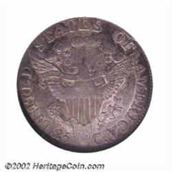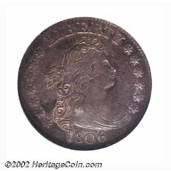 1806 25C AU55 NGC. B-9, R.1. A later die state, the obverse exhibits a bisecting crack (as struck) from the rim outside the E in LIBERTY to the rim below the 1 in the date. Judging by current Guide Book prices, the 1806 is one of the more readily obtainable dates in the Draped Bust, Heraldic Eagle Quarter series of 1804-1807. Of course, survivors of all dates in this series are difficult to locate in grades at or near the Mint State threshold. This is an originally preserved survivor with a base of dove-gray toning over which dappled steel-gray shadings have gathered. The color lightens in the more protected around the devices, all of which are appreciably bold for the type with the exception of the stars and clouds above the eagle's head. Well centered with bold clashmarks (as produced) on both sides and no singularly mentionable abrasions. Important notice: We expect to be auctioning lots at the rate of 200-250 per hour. Sometimes eBay Premier live bid software cannot keep up with that pace, so we strongly recommend that you place a realistic proxy bid now as insurance to avoid disappointment. Also please note that all Heritage/CAA lots purchased through eBay Premier carry a 20% Buyer's Premium. Please make sure you read the Terms and Conditions.