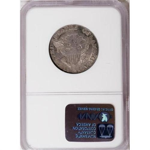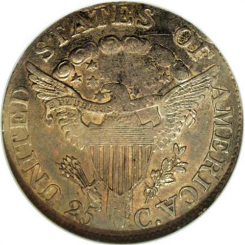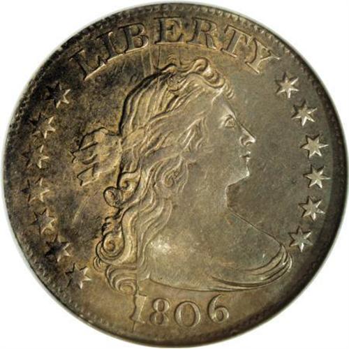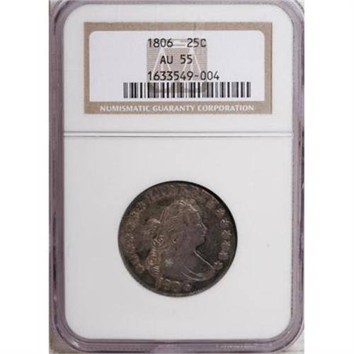 <B>1806 25C AU55 NGC.</B></I> B-9, R.1. A later die state, the obverse exhibits a bisecting crack (as struck) from the rim outside the E in LIBERTY to the rim below the 1 in the date. Judging by current <I>Guide Book</B></I> prices, the 1806 is one of the more readily obtainable dates in the Draped Bust, Heraldic Eagle Quarter series of 1804-1807. Of course, survivors of all dates in this series are difficult to locate in grades at or near the Mint State threshold. This is an originally preserved survivor with a base of dove-gray toning over which dappled steel-gray shadings have gathered. The color lightens in the more protected around the devices, all of which are appreciably bold for the type with the exception of the stars and clouds above the eagle's head. Well centered with bold clash marks (as produced) on both sides and no singularly mentionable abrasions.<BR><I>From The Arnold & Harriet Collection.</B></I><BR><BR><B>Coin Engraver:</B> Robert Scot<BR><BR><b>Shipping:</b> Coins & Currency (<a target="_blank" href="http://www.heritageauctions.com/common/shipping.php">view shipping information</a>\)