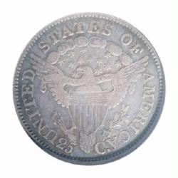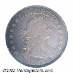 <TABLE cellSpacing=0 cellPadding=0 width="100%" bgColor=#000000 border=0><TBODY><TR><TD width="100%"><TABLE cellSpacing=1 cellPadding=3 width="100%" border=0><TBODY><TR><TD width="100%" bgColor=#79735c><FONT face=arial color=#ffffff size=3><B>Description</B> </FONT></TD></TR><TR><TD width="100%" bgColor=#ffffff><FONT face=arial size=2><B>1806 25C Fine 15 NGC.</B></I> B-8, High R.6. The upright of the E in STATES is past the cloud break, and TE in STATES is widely separated. An extremely rare variety with no known prior appearances in a Heritage sale. Breen's Condition Census terminated with a Good 6 example. This is the plate coin in the Ard Browning/Walter Breen standard reference, pedigreed by the faint pinscratches on the horizontal shield lines and a tiny planchet flaw behind the lower hair tresses. The eagle is quite sharp, while the portrait has just enough wear to prevent a VF designation. The piece is bathed in deep lavender patina. Accompanied by an old collector's envelope, apparently purchased from Julian Leidman on 11/1976. </FONT></TD></TR></TBODY></TABLE></TD></TR></TBODY></TABLE><BR><A name=PricesRealized></A><TABLE cellSpacing=0 cellPadding=0 width="100%" bgColor=#000000 border=0><TBODY><TR><TD width="100%"><TABLE cellSpacing=1 cellPadding=3 width="100%" border=0><TBODY><TR><TD width="100%" bgColor=#79735c><A name=PR><FONT face=arial color=#ffffff size=3><B>Previous Prices from Heritage Auctions</B> </FONT></A></TD></TR><TR><TD bgColor=#f6f6ed><TABLE cellSpacing=0 cellPadding=0 width="100%" border=1><TBODY><TR><TD align=middle width="33%"><B>Date</B></TD><TD align=middle width="33%"><B>Service</B></TD><TD align=middle width="33%"><B>Price</B></TD></TR><TR bgColor=whitesmoke><TD width="33%"><B>09/30/2002</B></TD><TD width="33%">PCGS</TD><TD width="33%">$402.50</TD></TR><TR bgColor=whitesmoke><TD width="33%"><B>08/14/1999</B></TD><TD width="33%">NGC</TD><TD width="33%">$299.00</TD></TR><TR bgColor=whitesmoke><TD width="33%"><B>08/16/1995</B></TD><TD width="33%">NGC</TD><TD width="33%">$286.00</TD></TR><TR bgColor=whitesmoke><TD width="33%"><B>03/22/1997</B></TD><TD width="33%">ANACS</TD><TD width="33%">$218.50</TD></TR><TR bgColor=whitesmoke><TD width="33%"><B>03/22/1997</B></TD><TD width="33%">ANACS</TD><TD width="33%">$287.50</TD></TR><TR bgColor=whitesmoke><TD width="33%"><B>08/19/1995</B></TD><TD width="33%">ANACS</TD><TD width="33%">$275.00</TD></TR></TBODY></TABLE></TD></TR><TR><TD bgColor=#ffffff><FONT face=arial size=1 ?>PLEASE NOTE: All prices realized reflect the final hammer price PLUS the buyer's premium in auctions that charge a buyer's premium. Each item has a notation at the top of the listing indicating whether that lot included a buyer's premium. Example: A item that sells with a final hammer price of $100 and a 20% buyer's premium will display with a price realized of $120. All information listed is intended to be as accurate as possible, but errors are possible. Please use this guide carefully and inform us of any inaccuracies. </FONT></TD></TR></TBODY></TABLE></TD></TR></TBODY></TABLE><BR><TABLE cellSpacing=0 cellPadding=0 width="100%" bgColor=#000000 border=0><TBODY><TR><TD width="100%"><TABLE cellSpacing=1 cellPadding=3 width="100%" border=0><TBODY><TR><TD width="100%" bgColor=#79735c colSpan=6><FONT face=arial color=#ffffff size=3><B>Price Guide*</B> </FONT></TD></TR><TR bgColor=#f6f6ed><TD align=middle><B>Grade</B> </TD><TD align=middle><B>Coin World<BR>(Trends)</B> </TD><TD align=middle><B>Numismedia<BR>Retail</B> </TD><TD align=middle><B>Numismedia<BR>Wholesale</B> </TD><TD align=middle><B>Coin<BR>Universe</B> </TD><TD align=middle><B>Heritage<BR>Value Index</B> </TD></TR><TR bgColor=#ffffff><TD align=middle>12</TD><TD align=right>$600.00</TD><TD align=right>$400.00</TD><TD align=right>$333.00</TD><TD align=right>$490.00</TD><TD align=right>$343.25</TD></TR><TR style="FONT-WEIGHT: bold" bgColor=#cccfdd><TD align=middle>15</TD><TD align=right>---</TD><TD align=right>---</TD><TD align=right>---</TD><TD align=right>---</TD><TD align=right>$432.08</TD></TR><TR bgColor=#ffffff><TD align=middle>20</TD><TD align=right>$1,000.00</TD><TD align=right>$720.00</TD><TD align=right>$575.00</TD><TD align=right>---</TD><TD align=right>$602.50</TD></TR><TR bgColor=#ffffff><TD colSpan=6><FONT size=1>*All information listed is intended to be as accurate as possible, but errors are possible. No item may be returned or refused based on this information which is provided as a service to our customers. You should contact each pricing source directly to determine the accuracy of this information. </FONT></TD></TR></TBODY></TABLE></TD></TR></TBODY></TABLE><BR><TABLE cellSpacing=0 cellPadding=0 width="100%" bgColor=#000000 border=0><TBODY><TR><TD width="100%"><TABLE cellSpacing=1 cellPadding=3 width="100%" border=0><TBODY><TR><TD width="100%" bgColor=#79735c><FONT face=arial color=#ffffff size=3><B>Population Guide</B> </FONT></TD></TR><TR bgColor=#ffffff><TD align=middle><!-- Begin Output of Population Grid--><TABLE cellSpacing=0 cellPadding=0 width="100%" border=0><TBODY><TR><TD vAlign=center><TABLE cellSpacing=0 width="100%" border=1 cellsadding="3"><TBODY><TR><TD vAlign=center><TABLE cellSpacing=0 cellPadding=3 width="100%" border=1><TBODY><TR><TD vAlign=center align=middle bgColor=#f0f1e8 colSpan=2 <CENTER><FONT face=Arial size=2><B>PCGS Pop </B></FONT><CENTER></CENTER></TD><TD vAlign=center align=middle bgColor=#f0f1e8 colSpan=2><CENTER><FONT face=Arial size=2><B>NGC Pop</B></CENTER></FONT></TD></TR><TR><TD vAlign=center><FONT face=Arial size=2>(15)</FONT> </TD><TD vAlign=center align=right><FONT face=Arial size=2>15</FONT> </TD><TD vAlign=center><FONT face=Arial size=2>(15)</FONT> </TD><TD vAlign=center align=right><FONT face=Arial size=2>14</FONT> </TD></TR><TR><TD vAlign=center><FONT face=Arial size=2>(>15)</FONT> </TD><TD vAlign=center align=right><FONT face=Arial size=2>178</FONT> </TD><TD vAlign=center><FONT face=Arial size=2>(>15)</FONT> </TD><TD vAlign=center 