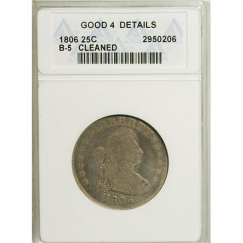<B>1806 25C --Cleaned--ANACS. Good 4 Details.</B></I> <B>B-5, R.5.</B></I> NGC Census: (10/276). PCGS Population (19/367). Mintage: 206,124. Numismedia Wsl. Price for NGC/PCGS coin in G4 : $167. (#5314)<BR><BR><B>Coin Engraver:</B> Robert Scot<BR><BR><b>Shipping:</b> Coins & Currency (<a target="_blank" href="http://www.heritageauctions.com/common/shipping.php">view shipping information</a>\)