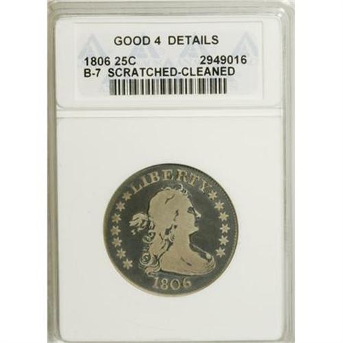 <B>1806 25C --Cleaned, Scratched--ANACS. Good 4 Details.</B></I> <B>B-10, R.5. Incorrectly designated as B-7 by ANACS</B></I>. NGC Census: (10/276). PCGS Population (19/367). Mintage: 206,124. Numismedia Wsl. Price for NGC/PCGS coin in G4 : $167. (#5314)<BR><BR><B>Coin Engraver:</B> Robert Scot<BR><BR><b>Shipping:</b> Coins & Currency (<a target="_blank" href="http://www.heritageauctions.com/common/shipping.php">view shipping information</a>\)