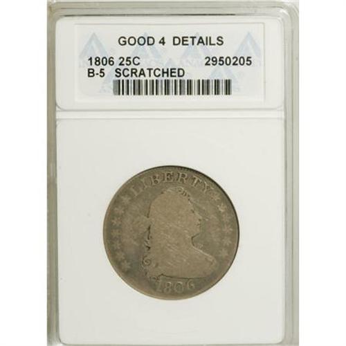 <B>1806 25C --Scratched--ANACS. Good 4 Details.</B></I> <B>B-5, R.5.</B></I> NGC Census: (10/276). PCGS Population (19/367). Mintage: 206,124. Numismedia Wsl. Price for NGC/PCGS coin in G4 : $167. (#5314)<BR><BR><B>Coin Engraver:</B> Robert Scot<BR><BR><b>Shipping:</b> Coins & Currency (<a target="_blank" href="http://www.heritageauctions.com/common/shipping.php">view shipping information</a>\)