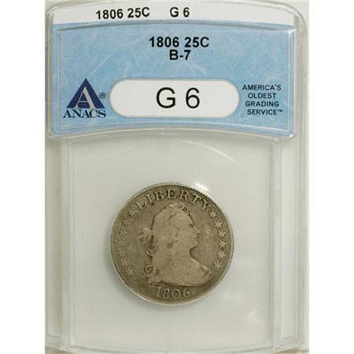 <B>1806 25C Good 6 ANACS.</B></I> B-5, R.5. Breen Die state is between I and II with a faint crack from the left corner of the Y. Incorrectly designated by ANACS as B-7, which has a star <I>beneath</B></I> the beak instead of immediately left. This slate-gray example has bold definition for the Good 6 grade, since the peripheral stars and legends are distant from the rim and some shield detail is present. Generally smooth with only a couple of minor pinscratches.<BR><BR><b>Shipping:</b> Coins & Currency (<a target="_blank" href="http://www.heritageauctions.com/common/shipping.php">view shipping information</a>)