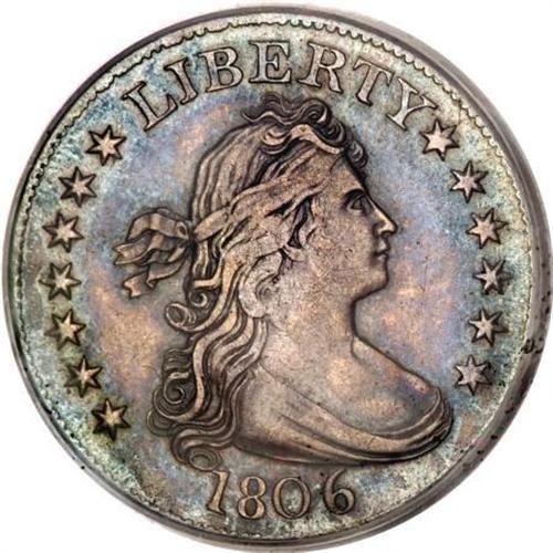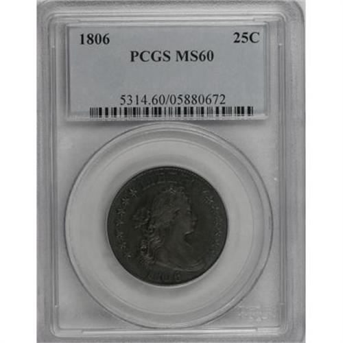 <B>1806 25C MS60 PCGS.</B></I> B-3, R.1. The defective right foot on the I of LIBERTY, along with a leaf point under the center of the I in AMERICA and the 5 in the denomination not touching the fletchings, confirms the die pairing. This is an early striking from Die State I, which Breen-Browning note has a "long spine from lowest leaf on right to tail of R; this fades out." The "spine" or die line here is quite bold, confirming the early die state. <BR> While this variety is considered one of the most common for the year, in Mint State it is rare, as Breen-Browning also notes. A search through our Permanent Auction Archives reveals that only three times before have we offered higher-graded examples. The strike is soft through the centers, as always, and the MS60 grade is a likely byproduct of the somewhat murky deep blue-green and purple toning, which is nonetheless attractive if not compelling.<BR><BR><B>Coin Engraver:</B> Robert Scot<BR><BR><b>Shipping:</b> Coins & Currency (<a target="_blank" href="http://www.heritageauctions.com/common/shipping.php">view shipping information</a>)