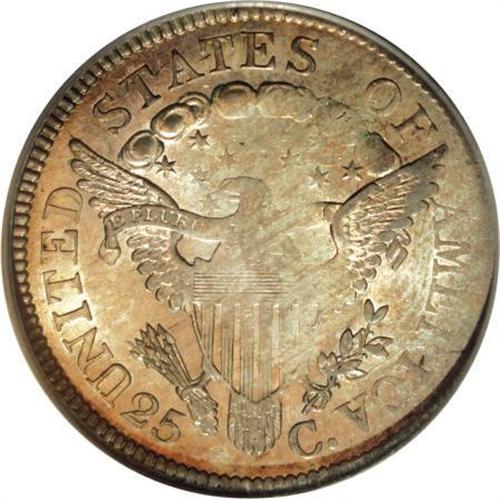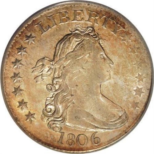 <B>1806 25C MS62 PCGS.</B></I> B-3, R.1. The foot of the 1 in the date and the T in LIBERTY are defective at left, and the 5 in 25 C. dose not touch the arrows. Light golden-tan patina covers lustrous surfaces that are weakly struck in the centers. A few minor obverse marks are not disturbing. Overall, a rather pleasing coin for the grade.<BR><BR><B>Coin Engraver:</B> Robert Scot<BR><BR><b>Shipping:</b> Coins & Currency (<a target="_blank" href="http://www.heritageauctions.com/common/shipping.php">view shipping information</a>)