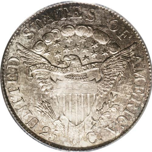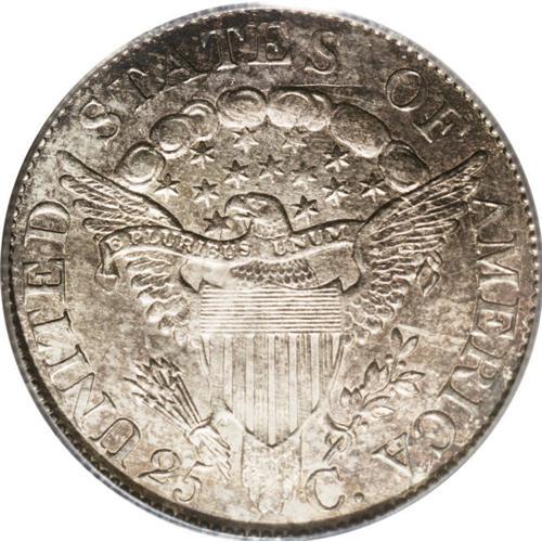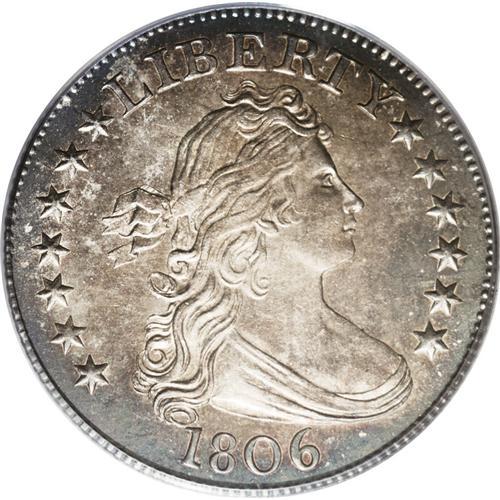 <B>1806<25C> MS64 PCGS.</B></I> B-10, R.5. Beautifully patinated in sea-green, copper-red, rose, and cobalt-blue shades. The satin luster is comprehensive. Generally well struck, since only the vertical shield lines show evidence of any noticeable weakness. A hint of contact is found near the jaw, but overall, the preservation is outstanding for the MS64 level on a Draped Bust quarter. Beyond the technical grade, it must be mentioned that the eye appeal is also superior, since many Mint State examples of this type are dipped out or deeply toned. The present originally and attractively toned piece, when its strike and preservation is also taken into account, is worthy of the finest quality silver type set. Certified in a green label holder. Census: 13 in 64, 3 finer (9/06).
