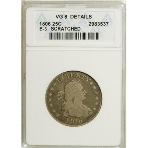 <B>1806 25C --Scratched--ANACS. VG8 Details.</B></I> B-3. NGC Census: (26/235). PCGS Population (25/318). Mintage: 206,124. Numismedia Wsl. Price for NGC/PCGS coin in VG8 : $225. (#5314)<BR><BR><b>Shipping:</b> Coins & Currency (<a target="_blank" href="http://www.heritageauctions.com/common/shipping.php">view shipping information</a>)
