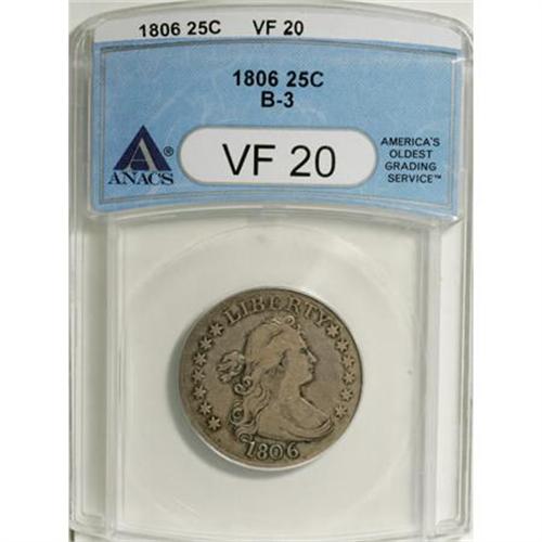 <B>1806 25C VF20 ANACS.</B></I> B-3, R.1. The I in LIBERTY has a defective right foot, and the 5 and C in the denomination on the reverse are clear of the central devices. Elements of blue and lavender grace the silver-gray surfaces of this moderately circulated early quarter. Minimally marked and appealing.<BR><BR><B>Coin Engraver:</B> Robert Scot<BR><BR><b>Shipping:</b> Coins & Currency (<a target="_blank" href="http://www.heritageauctions.com/common/shipping.php">view shipping information</a>)