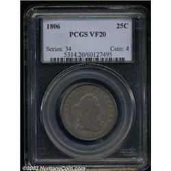 <TABLE cellSpacing=0 cellPadding=0 width="100%" bgColor=#000000 border=0><TBODY><TR><TD width="100%"><TABLE cellSpacing=1 cellPadding=3 width="100%" border=0><TBODY><TR><TD width="100%" bgColor=#79735c><FONT face=arial color=#ffffff size=3><B>Description</B> </FONT></TD></TR><TR><TD width="100%" bgColor=#ffffff><FONT face=arial size=2><B>1806 25C VF20 PCGS.</B></I> B-5, High R.6. A rare variety attributable by the die crack (as made) from the rim at 10 o'clock to a wing feather. Deeply toned in olive and dove-gray colors. Some wing plumage detail persists, and the surfaces are refreshingly smooth. Struck from slightly rotated dies. </FONT></TD></TR></TBODY></TABLE></TD></TR></TBODY></TABLE><BR><A name=PricesRealized></A><TABLE cellSpacing=0 cellPadding=0 width="100%" bgColor=#000000 border=0><TBODY><TR><TD width="100%"><TABLE cellSpacing=1 cellPadding=3 width="100%" border=0><TBODY><TR><TD width="100%" bgColor=#79735c><A name=PR><FONT face=arial color=#ffffff size=3><B>Previous Prices from Heritage Auctions</B> </FONT></A></TD></TR><TR><TD bgColor=#f6f6ed><TABLE cellSpacing=0 cellPadding=0 width="100%" border=1><TBODY><TR><TD align=middle width="33%"><B>Date</B></TD><TD align=middle width="33%"><B>Service</B></TD><TD align=middle width="33%"><B>Price</B></TD></TR><TR bgColor=whitesmoke><TD width="33%"><B>08/06/2002</B></TD><TD width="33%">PCGS</TD><TD width="33%">$862.50</TD></TR><TR bgColor=whitesmoke><TD width="33%"><B>08/13/1999</B></TD><TD width="33%">NGC</TD><TD width="33%">$575.00</TD></TR><TR bgColor=whitesmoke><TD width="33%"><B>08/13/1999</B></TD><TD width="33%">ANACS</TD><TD width="33%">$356.50</TD></TR><TR bgColor=whitesmoke><TD width="33%"><B>09/01/1997</B></TD><TD width="33%">NGC</TD><TD width="33%">$550.00</TD></TR></TBODY></TABLE></TD></TR><TR><TD bgColor=#ffffff><FONT face=arial size=1 ?>PLEASE NOTE: All prices realized reflect the final hammer price PLUS the buyer's premium in auctions that charge a buyer's premium. Each item has a notation at the top of the listing indicating whether that lot included a buyer's premium. Example: A item that sells with a final hammer price of $100 and a 20% buyer's premium will display with a price realized of $120. All information listed is intended to be as accurate as possible, but errors are possible. Please use this guide carefully and inform us of any inaccuracies. </FONT></TD></TR></TBODY></TABLE></TD></TR></TBODY></TABLE><BR><TABLE cellSpacing=0 cellPadding=0 width="100%" bgColor=#000000 border=0><TBODY><TR><TD width="100%"><TABLE cellSpacing=1 cellPadding=3 width="100%" border=0><TBODY><TR><TD width="100%" bgColor=#79735c colSpan=6><FONT face=arial color=#ffffff size=3><B>Price Guide*</B> </FONT></TD></TR><TR bgColor=#f6f6ed><TD align=middle><B>Grade</B> </TD><TD align=middle><B>Coin World<BR>(Trends)</B> </TD><TD align=middle><B>Numismedia<BR>Retail</B> </TD><TD align=middle><B>Numismedia<BR>Wholesale</B> </TD><TD align=middle><B>Coin<BR>Universe</B> </TD><TD align=middle><B>Heritage<BR>Value Index</B> </TD></TR><TR bgColor=#ffffff><TD align=middle>15</TD><TD align=right>---</TD><TD align=right>---</TD><TD align=right>---</TD><TD align=right>---</TD><TD align=right>$432.08</TD></TR><TR style="FONT-WEIGHT: bold" bgColor=#cccfdd><TD align=middle>20</TD><TD align=right>$1,000.00</TD><TD align=right>$720.00</TD><TD align=right>$575.00</TD><TD align=right>---</TD><TD align=right>$602.50</TD></TR><TR bgColor=#ffffff><TD align=middle>25</TD><TD align=right>---</TD><TD align=right>---</TD><TD align=right>---</TD><TD align=right>---</TD><TD align=right>$676.04</TD></TR><TR bgColor=#ffffff><TD colSpan=6><FONT size=1>*All information listed is intended to be as accurate as possible, but errors are possible. No item may be returned or refused based on this information which is provided as a service to our customers. You should contact each pricing source directly to determine the accuracy of this information. </FONT></TD></TR></TBODY></TABLE></TD></TR></TBODY></TABLE><BR><TABLE cellSpacing=0 cellPadding=0 width="100%" bgColor=#000000 border=0><TBODY><TR><TD width="100%"><TABLE cellSpacing=1 cellPadding=3 width="100%" border=0><TBODY><TR><TD width="100%" bgColor=#79735c><FONT face=arial color=#ffffff size=3><B>Population Guide</B> </FONT></TD></TR><TR bgColor=#ffffff><TD align=middle><!-- Begin Output of Population Grid--><TABLE cellSpacing=0 cellPadding=0 width="100%" border=0><TBODY><TR><TD vAlign=center><TABLE cellSpacing=0 width="100%" border=1 cellsadding="3"><TBODY><TR><TD vAlign=center><TABLE cellSpacing=0 cellPadding=3 width="100%" border=1><TBODY><TR><TD vAlign=center align=middle bgColor=#f0f1e8 colSpan=2 <CENTER><FONT face=Arial size=2><B>PCGS Pop </B></FONT><CENTER></CENTER></TD><TD vAlign=center align=middle bgColor=#f0f1e8 colSpan=2><CENTER><FONT face=Arial size=2><B>NGC Pop</B></CENTER></FONT></TD></TR><TR><TD vAlign=center><FONT face=Arial size=2>(20)</FONT> </TD><TD vAlign=center align=right><FONT face=Arial size=2>17</FONT> </TD><TD vAlign=center><FONT face=Arial size=2>(20)</FONT> </TD><TD vAlign=center align=right><FONT face=Arial size=2>6</FONT> </TD></TR><TR><TD vAlign=center><FONT face=Arial size=2>(>20)</FONT> </TD><TD vAlign=center align=right><FONT face=Arial size=2>161</FONT> </TD><TD vAlign=center><FONT face=Arial size=2>(>20)</FONT> </TD><TD vAlign=center align=right><FONT face=Arial size=2>123</FONT> </TD></TR></TBODY></TABLE></TD></TR></TBODY></TABLE></TD></TR></TBODY></TABLE><!-- End Output of Population Grid--> Important notice: Heritage usually auctions material at the rate of 200-250 lots per hour. On some occasions eBay Live bid software or the Internet may not be able to keep up with the pace of the auction. We recommend placing a realistic absentee bid now as insurance to avoid disappointment. Occasionally the auctioneer may eliminate or reject an eBay Live bid, and the auctioneer may also reopen a lot after the close of the eBay live bidding (usually because we missed an audience bid), and may reject y