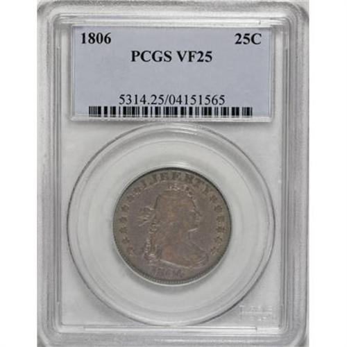 <B>1806 25C VF25 PCGS.</B></I> B-7, R.5. A much better variety, Browning-7 is identified by a slender vertical die crack through the central serif of the E in AMERICA. Rose-gray color dominates both sides of this VF25 example, and the design elements show nice detail for the grade. The surfaces are quite clean for a light to moderately circulated coin.<BR><BR><B>Coin Engraver:</B> Robert Scot<BR><BR><b>Shipping:</b> Coins & Currency (<a target="_blank" href="http://www.heritageauctions.com/common/shipping.php">view shipping information</a>)