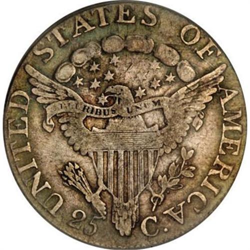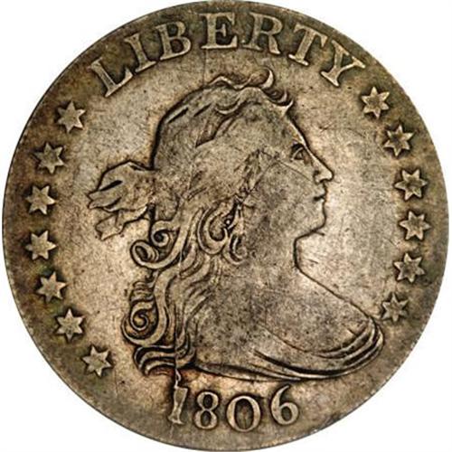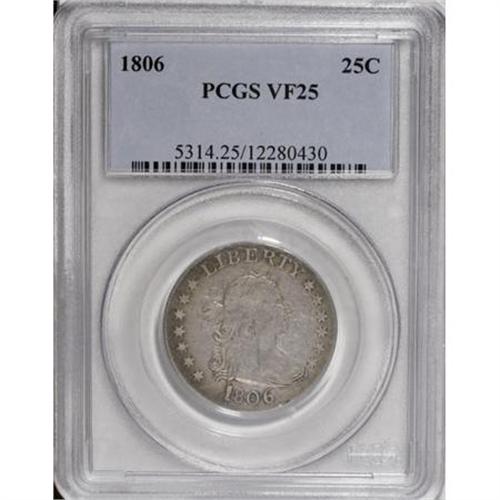 <B>1806 25C VF25 PCGS.</B></I> B-9a, R.1. Die State XI, with the lowest hair curls lapped. A bold die crack bisects the obverse between 12 and 7 o'clock, confirming B-9a. Light gray surfaces display olive-green patina at the margins, and sharp detail is seen on the design elements. A few light circulation marks do not disturb.<BR><BR><B>Coin Engraver:</B> Robert Scot<BR><BR><b>Shipping:</b> Coins & Currency (<a target="_blank" href="http://www.heritageauctions.com/common/shipping.php">view shipping information</a>)