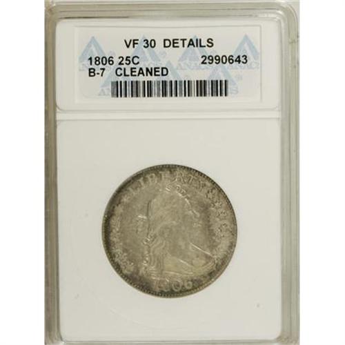 <B>1806 25C --Cleaned--ANACS. VF30 Details.</B></I> B-7. NGC Census: (20/133). PCGS Population (23/160). Mintage: 206,124. Numismedia Wsl. Price for NGC/PCGS coin in VF30: $985. (#5314)<BR><BR><B>Coin Engraver:</B> Robert Scot<BR><BR><b>Shipping:</b> Coins & Currency (<a target="_blank" href="http://www.heritageauctions.com/common/shipping.php">view shipping information</a>\)