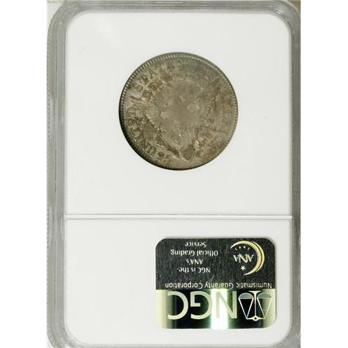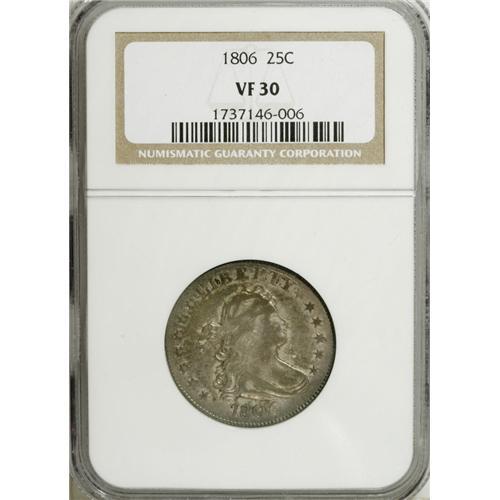 <B>1806 25C VF30 NGC.</B></I> B-4, R.4. A very scarce variety, one distinguished by the separation of the 5 and C in the denomination from the eagle's tailfeathers and a "perfect" obverse die. The moderately worn surfaces are gunmetal-gray and pearl-gray with warm rose overtones.<BR><BR><b>Shipping:</b> Coins & Currency (<a target="_blank" href="http://www.heritageauctions.com/common/shipping.php">view shipping information</a>)