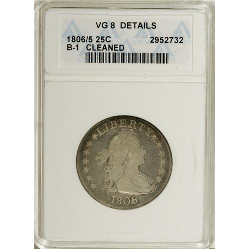 <B>1806/5 25C --Cleaned--ANACS. VG8 Details.</B></I> NGC Census: (7/131). PCGS Population (7/99). Numismedia Wsl. Price: $242. (#5315)<BR><BR><b>Shipping:</b> Coins & Currency (<a target="_blank" href="http://www.heritageauctions.com/common/shipping.php">view shipping information</a>)