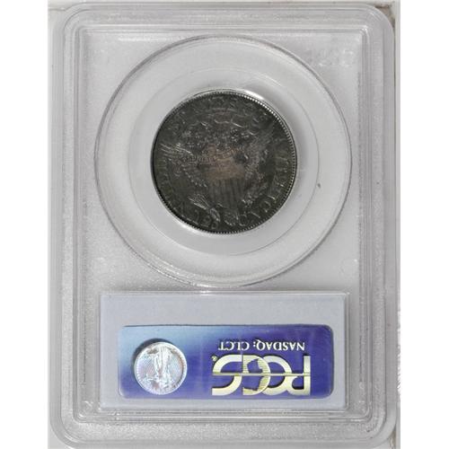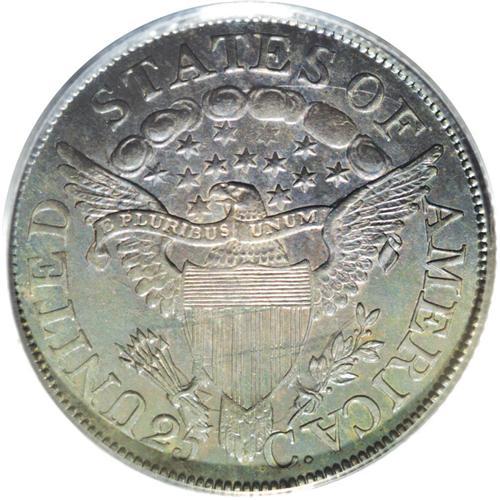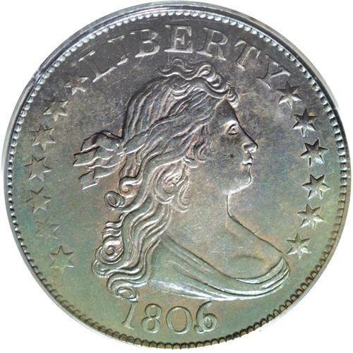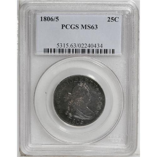 <B>1806/5<25C> MS63 PCGS.</B></I> B-1, R.2. Deeply toned surfaces on both sides of this splendid Select Mint State example. This is a nicely centered impression with full border details, save for some notable softness on the obverse peripheral stars. Both sides have dark gunmetal toning with slightly lighter pinkish color at the centers. Although not fully struck, all of the design elements are quite well detailed. The overdate feature is bold and easily visible, even without magnification, a noteworthy feature on this coin. Prominent die clash marks are visible on both the obverse and reverse. Few examples of this variety meet or exceed this specimen for quality. Population: 4 in 63, 4 finer (7/06).