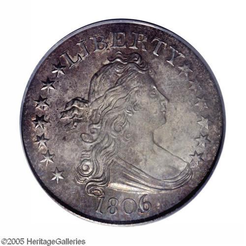 <B>1806/5<25C> MS63 PCGS.</B></I> B-1, R.2. Dusky dove-gray, sea-green, and russet-brown colors embrace this impressive Draped Bust Quarter. Well struck for the type, which is difficult to find sharp, mostly due to Liberty's high relief shoulder. Only the top right reverse star exhibits significant softness. A tiny tick beneath the eye is mentioned for pedigree purposes, since no other blemishes are readily found. An obvious overdate, the lower half of the 5 is clear within the loop of the 6. The mint must have had problems with their letter punches in the first decade of the 19th century, since the I, T, and 1 punches each have a defective foot. Light clash marks (as made) are visible near Liberty's ear. Population: 3 in 63, 4 finer (10/05).<BR><I>Ex: Ira & Larry Goldberg, 9/02, lot 290, which realized $20,125.</B></I>