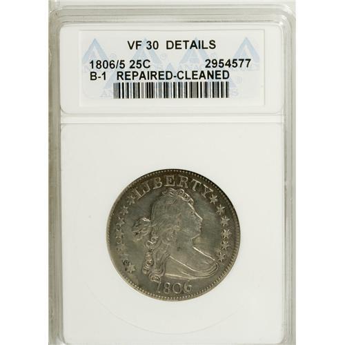 <B>1806/5 25C --Repaired, Cleaned--ANACS. VF30 Details.</B></I> B-1, R.2. The obverse field was smoothed, then cleaned to conceal the repair. Pearl-gray with peripheral ice-blue. Glimpses of luster emerge from the reverse design.<BR><I>From The Hoosier Discovery Collection.</B></I><BR><BR><b>Shipping:</b> Coins & Currency (<a target="_blank" href="http://www.heritageauctions.com/common/shipping.php">view shipping information</a>)