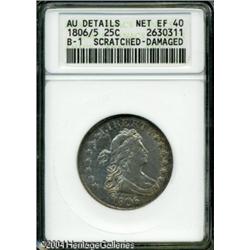 1806/5 25C --Scratched, Damaged--ANACS. AU Details, N <B>1806/5 25C --Scratched, Damaged--ANACS. AU Details, Net XF40.</B></I> B-1, R.2. Peripheral golden-brown color and impressive shimmering luster confirm the AU sharpness of this boldly overdated Draped Bust Quarter. Small circular punches on Liberty's eye and neck and a pinscratch near her chin reduce the eye appeal. A couple of small digs and some marks above the olive branch also merit mention. <BR><BR><B>Important notice:</B> Heritage usually auctions material at the rate of 200-250 lots per hour. On some occasions eBay Live bid software or the Internet may not be able to keep up with the pace of the auction. We recommend placing a realistic absentee bid now as insurance to avoid disappointment. Occasionally the auctioneer may eliminate or reject an eBay Live bid, and the auctioneer may also reopen a lot after the close of the eBay live bidding (usually because we missed an audience bid), and may reject your bid even if it shows you as the winning bidder. By bidding via eBay Live, you agree that Heritage may award the lot to another bidder at its sole discretion under the circumstances described above or any other reasonable circumstances. Since eBay bids are not shown to us until we open the lot on the floor, we treat those bids just like floor bids. In most cases the floor responds before the eBay bid is presented to us, due to Internet lag time, so for consistency we have made it a policy that floor bids are always considered first over tie eBay live bids. Also please note that all Heritage lots purchased through eBay Live carry a 20% Buyer's Premium. Please make sure you read the Terms and Conditions before you bid. This lot is being auctioned in conjunction with a live floor auction by Heritage Galleries & Auctioneers. All final auction and invoice information will be supplied by Heritage Galleries & Auctioneers, and all other information should be considered preliminary. Lot:5873