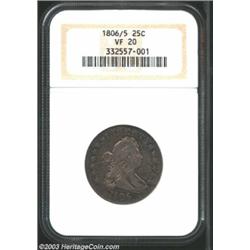 <TABLE cellSpacing=0 cellPadding=0 width="100%" bgColor=#000000 border=0><TBODY><TR><TD width="100%"><TABLE cellSpacing=1 cellPadding=3 width="100%" border=0><TBODY><TR><TD width="100%" bgColor=#79735c><FONT face=arial color=#ffffff size=3><B>Description</B> </FONT></TD></TR><TR><TD width="100%" bgColor=#ffffff><FONT face=arial size=2><B>1806/5 25C VF20 NGC.</B></I> B-1, R.2. The underdigit 5 is obvious on this variety. Deep honey-gold, navy-blue, and gunmetal-gray patina. Although the obverse has a few wispy slide marks, the hair tresses and eagle's plumage are abundantly detailed for the grade. </FONT></TD></TR></TBODY></TABLE></TD></TR></TBODY></TABLE><BR><A name=PricesRealized></A><TABLE cellSpacing=0 cellPadding=0 width="100%" bgColor=#000000 border=0><TBODY><TR><TD width="100%"><TABLE cellSpacing=1 cellPadding=3 width="100%" border=0><TBODY><TR><TD width="100%" bgColor=#79735c><A name=PR><FONT face=arial color=#ffffff size=3><B>Previous Prices from Heritage Auctions</B> </FONT></A></TD></TR><TR><TD bgColor=#f6f6ed><TABLE cellSpacing=0 cellPadding=0 width="100%" border=1><TBODY><TR><TD align=middle width="33%"><B>Date</B></TD><TD align=middle width="33%"><B>Service</B></TD><TD align=middle width="33%"><B>Price</B></TD></TR><TR bgColor=whitesmoke><TD width="33%"><B>03/01/2003</B></TD><TD width="33%">PCGS</TD><TD width="33%">$1,035.00</TD></TR><TR bgColor=whitesmoke><TD width="33%"><B>11/01/1997</B></TD><TD width="33%">ANACS</TD><TD width="33%">$770.00</TD></TR></TBODY></TABLE></TD></TR><TR><TD bgColor=#ffffff><FONT face=arial size=1 ?>PLEASE NOTE: All prices realized reflect the final hammer price PLUS the buyer's premium in auctions that charge a buyer's premium. Each item has a notation at the top of the listing indicating whether that lot included a buyer's premium. Example: A item that sells with a final hammer price of $100 and a 20% buyer's premium will display with a price realized of $120. All information listed is intended to be as accurate as possible, but errors are possible. Please use this guide carefully and inform us of any inaccuracies. </FONT></TD></TR></TBODY></TABLE></TD></TR></TBODY></TABLE><BR><TABLE cellSpacing=0 cellPadding=0 width="100%" bgColor=#000000 border=0><TBODY><TR><TD width="100%"><TABLE cellSpacing=1 cellPadding=3 width="100%" border=0><TBODY><TR><TD width="100%" bgColor=#79735c colSpan=6><FONT face=arial color=#ffffff size=3><B>Price Guide*</B> </FONT></TD></TR><TR bgColor=#f6f6ed><TD align=middle><B>Grade</B> </TD><TD align=middle><B>Coin World<BR>(Trends)</B> </TD><TD align=middle><B>Numismedia<BR>Retail</B> </TD><TD align=middle><B>Numismedia<BR>Wholesale</B> </TD><TD align=middle><B>Coin<BR>Universe</B> </TD><TD align=middle><B>Heritage<BR>Value Index</B> </TD></TR><TR bgColor=#ffffff><TD align=middle>15</TD><TD align=right>---</TD><TD align=right>---</TD><TD align=right>---</TD><TD align=right>---</TD><TD align=right>$434.84</TD></TR><TR style="FONT-WEIGHT: bold" bgColor=#cccfdd><TD align=middle>20</TD><TD align=right>---</TD><TD align=right>$940.00</TD><TD align=right>$750.00</TD><TD align=right>---</TD><TD align=right>$573.75</TD></TR><TR bgColor=#ffffff><TD align=middle>25</TD><TD align=right>---</TD><TD align=right>---</TD><TD align=right>---</TD><TD align=right>---</TD><TD align=right>$756.25</TD></TR><TR bgColor=#ffffff><TD colSpan=6><FONT size=1>*All information listed is intended to be as accurate as possible, but errors are possible. No item may be returned or refused based on this information which is provided as a service to our customers. You should contact each pricing source directly to determine the accuracy of this information. </FONT></TD></TR></TBODY></TABLE></TD></TR></TBODY></TABLE><BR><TABLE cellSpacing=0 cellPadding=0 width="100%" bgColor=#000000 border=0><TBODY><TR><TD width="100%"><TABLE cellSpacing=1 cellPadding=3 width="100%" border=0><TBODY><TR><TD width="100%" bgColor=#79735c><FONT face=arial color=#ffffff size=3><B>Population Guide</B> </FONT></TD></TR><TR bgColor=#ffffff><TD align=middle><!-- Begin Output of Population Grid--><TABLE cellSpacing=0 cellPadding=0 width="100%" border=0><TBODY><TR><TD vAlign=center><TABLE cellSpacing=0 width="100%" border=1 cellsadding="3"><TBODY><TR><TD vAlign=center><TABLE cellSpacing=0 cellPadding=3 width="100%" border=1><TBODY><TR><TD vAlign=center align=middle bgColor=#f0f1e8 colSpan=2 <CENTER><FONT face=Arial size=2><B>PCGS Pop </B></FONT><CENTER></CENTER></TD><TD vAlign=center align=middle bgColor=#f0f1e8 colSpan=2><CENTER><FONT face=Arial size=2><B>NGC Pop</B></CENTER></FONT></TD></TR><TR><TD vAlign=center><FONT face=Arial size=2>(20)</FONT> </TD><TD vAlign=center align=right><FONT face=Arial size=2>6</FONT> </TD><TD vAlign=center><FONT face=Arial size=2>(20)</FONT> </TD><TD vAlign=center align=right><FONT face=Arial size=2>5</FONT> </TD></TR><TR><TD vAlign=center><FONT face=Arial size=2>(>20)</FONT> </TD><TD vAlign=center align=right><FONT face=Arial size=2>49</FONT> </TD><TD vAlign=center><FONT face=Arial size=2>(>20)</FONT> </TD><TD vAlign=center align=right><FONT face=Arial size=2>39</FONT> </TD></TR></TBODY></TABLE></TD></TR></TBODY></TABLE></TD></TR></TBODY></TABLE><!-- End Output of Population Grid--> Important notice: Heritage usually auctions material at the rate of 200-250 lots per hour. On some occasions eBay Live bid software or the Internet may not be able to keep up with the pace of the auction. We recommend placing a realistic absentee bid now as insurance to avoid disappointment. Occasionally the auctioneer may eliminate or reject an eBay Live bid, and the auctioneer may also reopen a lot after the close of the eBay live bidding (usually because we missed an audience bid), and may reject your bid even if it shows you as the winning bidder. By bidding via eBay Live, you agree that Heritage may award the lot to another bidder at its sole discretion under the circumstances described above or any other reasonable circumstances. Also please note that all Heritage lots