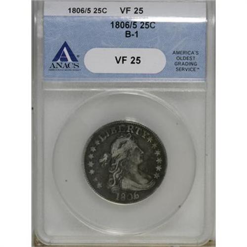 <B>1806/5 25C VF25 ANACS.</B></I> B-1. NGC Census: (8/46). PCGS Population (8/59). Numismedia Wsl. Price for NGC/PCGS coin in VF25: $1,611. (#5315)<BR><BR><B>Coin Engraver:</B> Robert Scot<BR><BR><b>Shipping:</b> Coins & Currency (<a target="_blank" href="http://www.heritageauctions.com/common/shipping.php">view shipping information</a>)
