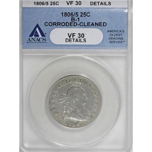 <B>1806/5 25C --Corroded, Cleaned--ANACS. VF30 Details.</B></I> B-1, R.2. This slate-gray example is cloudy and subdued from hairlines, and granular areas are noted near the date and STATES OF. Ample hair, plumage, and shield detail remains.<BR><BR><B>Coin Engraver:</B> Robert Scot<BR><BR><b>Shipping:</b> Coins & Currency (<a target="_blank" href="http://www.heritageauctions.com/common/shipping.php">view shipping information</a>)