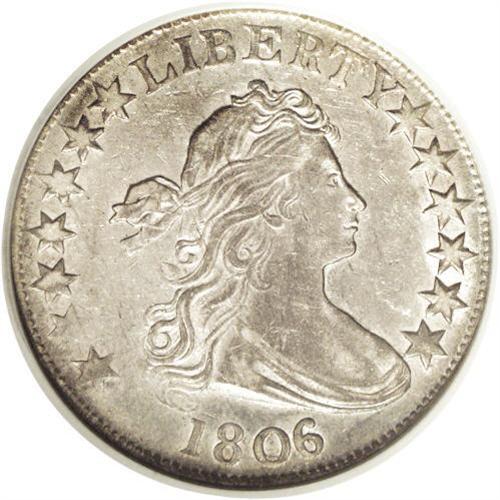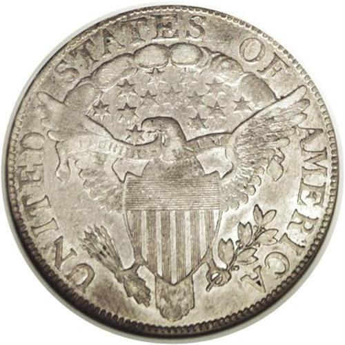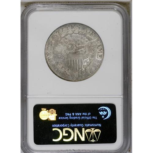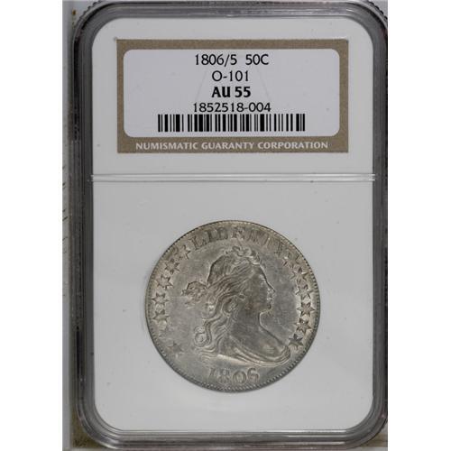 <B>1806/5<50C> AU55 NGC.</B></I> O-101, R.3. The year 1806 saw an enormous half dollar mintage of 839,576 pieces, from 12 different obverses and 21 reverses, for a total of 28 known Overton die marriages. The 1806 half dollar mintage was more than for the years 1794 through 1805 combined. This pairing has star 12 recut, and star 13 is joined to the bust. On the reverse there are five stemmed berries, the lowest one above the branch joined to the center leaf pair. While this piece shows the diagnostic die breaks around the obverse rim, the sometimes-seen break on the reverse through ITE is absent on this example. The attractive surfaces are silver-gray with gunmetal-gray highpoints. Much luster remains on this attractive piece that is probably near the low end of the Condition Census.