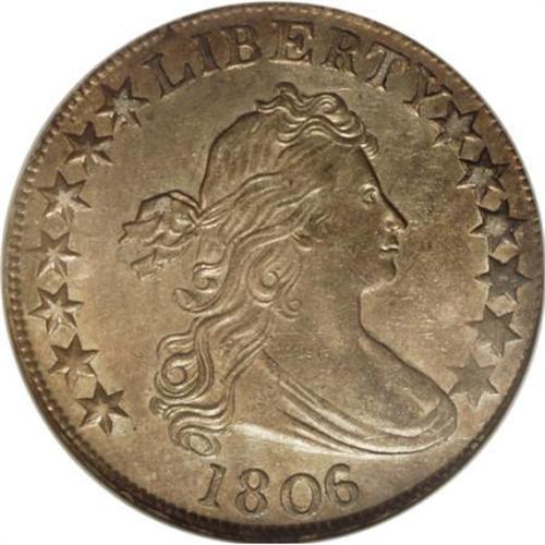 <B>1806/5 50C AU58 NGC.</B></I> O-101 prime, R.3 for the variety, but probably R.7 for the die state. This overdate 1806 half has an unusual die punching error with the 0 in the date punched over an earlier, mispunched horizontal 0. The Overton A reverse was only paired with this obverse, and is distinguished by recutting on the T in UNITED and the second T in STATES. An early die state, there are no traces of die cracks on either side.<BR> The surfaces retain generous amounts of bright mint luster around the devices on each side. The surfaces are medium gray with lilac undertones, and the striking details are strong in the centers. <BR> While a relatively common 1806 variety, only one Mint State piece apparently exists. This example is tied for second finest known. <BR> Haseltine-4, Beistle 10-P, Overton-1, 2, PCGS# 6077, Encyclopedia-4583.<BR><I>Ex: Sheridan Downey, privately (1/1998).<BR>From The Westmoreland County Collection of Early Bust Halves, 1794-1807.</B></I><BR><BR><B>Coin Engraver:</B> Robert Scot<BR><BR><b>Shipping:</b> Coins & Currency (<a target="_blank" href="http://www.heritageauctions.com/common/shipping.php">view shipping information</a>)