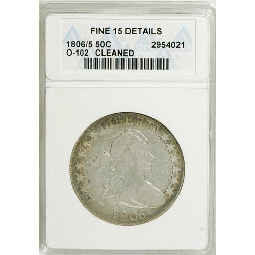 <B>1806/5 50C --Cleaned--ANACS. Fine 15 Details.</B></I> O-102. NGC Census: (7/185). PCGS Population (5/103). Numismedia Wsl. Price: $279. (#6077)<BR><BR><b>Shipping:</b> Coins & Currency (<a target="_blank" href="http://www.heritageauctions.com/common/shipping.php">view shipping information</a>)