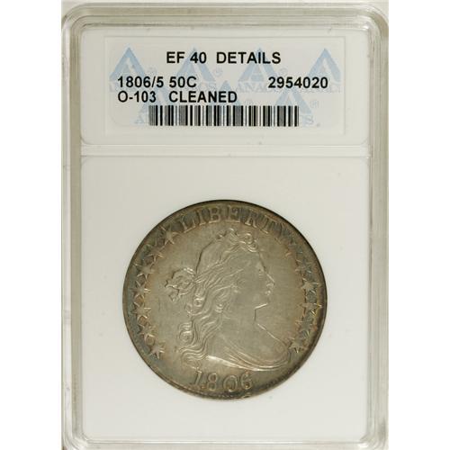 <B>1806/5 50C --Cleaned--ANACS. XF40 Details.</B></I> O-103, R.2. Sky-blue and tan enrich the margins of this evenly struck and hairlined piece. The obverse rim has a small ding at 5:30. Ample luster beckons from protected areas.<BR><I>From The Hoosier Discovery Collection.</B></I><BR><BR><b>Shipping:</b> Coins & Currency (<a target="_blank" href="http://www.heritageauctions.com/common/shipping.php">view shipping information</a>)